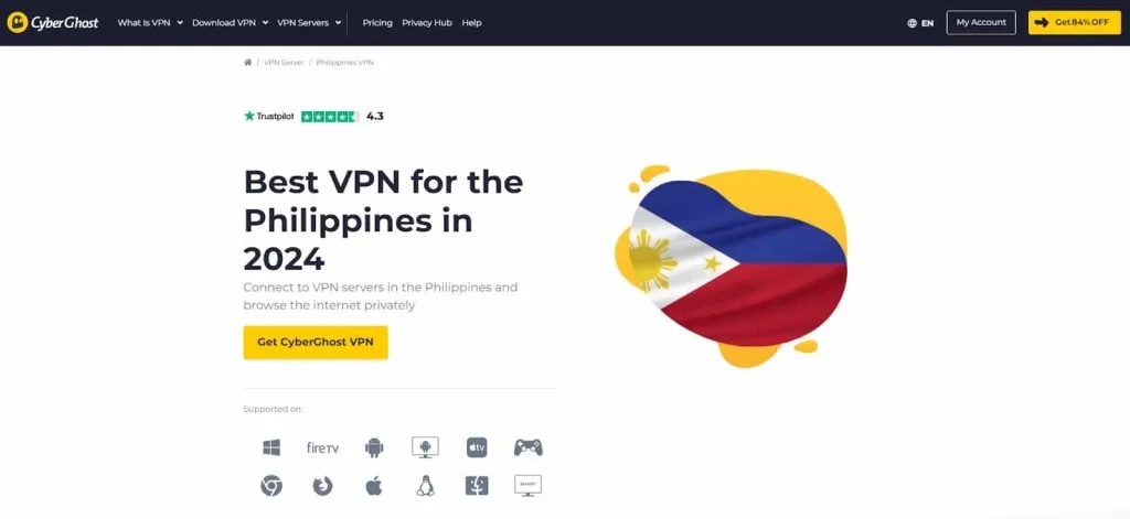 CyberGhost is a standout VPN choice for users in the Philippines, boasting an extensive server network and robust performance.
